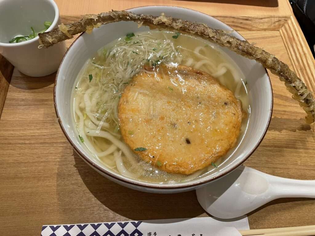 朝ごはんにごぼう天うどん。